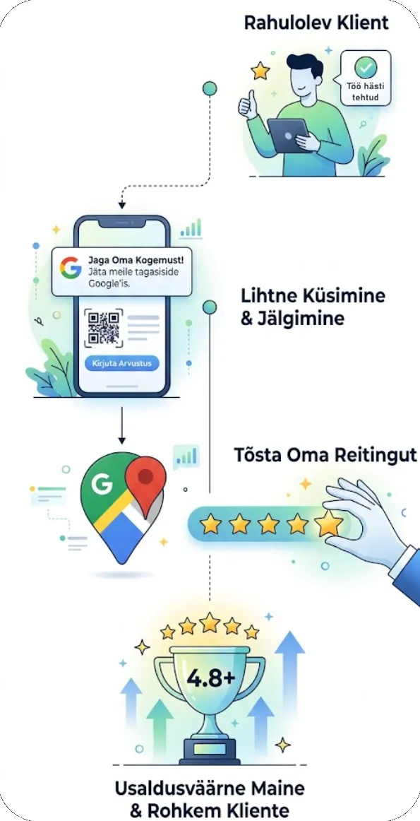 Kombineerime Google ettevõtteprofiili optimeerimise ja arvustuste juhtimise ühtseks kasvupaketiks, mis sobib just Eesti väikestele ja keskmise suurusega ettevõtetele.
